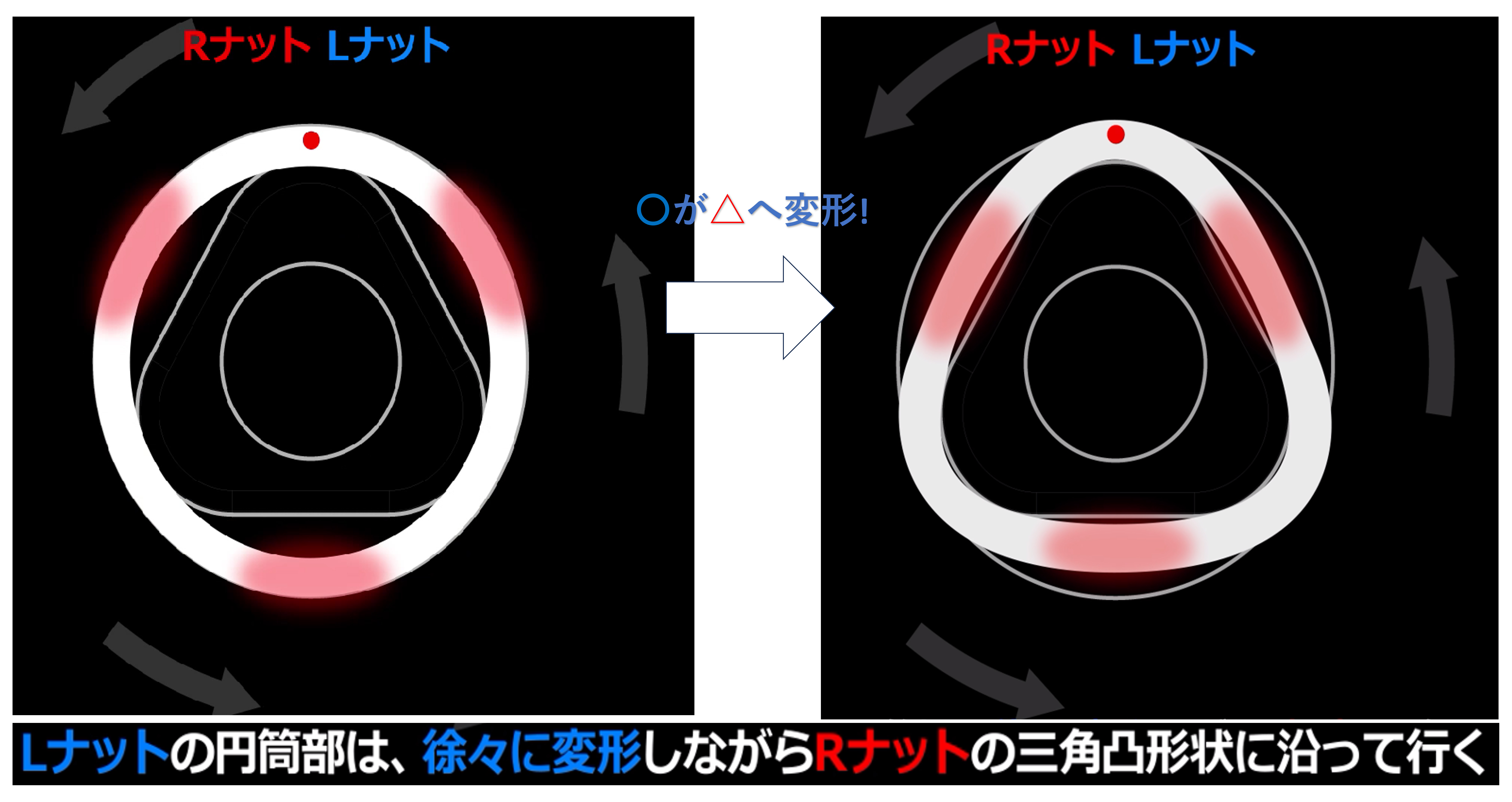 L/R-ΔLocは、右ねじのナット(Rナット)と左ねじのナット(Lナット)の双方を螺合可能なL/Rボルトに、先に螺合されるRナットに設けられた三角凸状を成すΔ(デルタ)部の3つの頂部が、後から螺合されるLナットに設けられた円筒部を弾塑性変形させながら弾力的に一体化させることで強靭なロッキングを実現します。